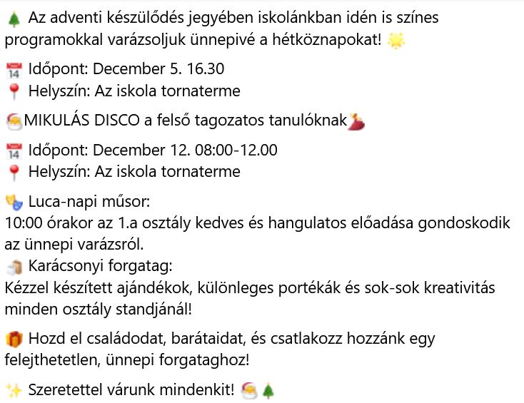 Az adventi készülődés jegyében iskolánkban idén is színes programokkal varázsoljuk ünnepivé a hétköznapokat!