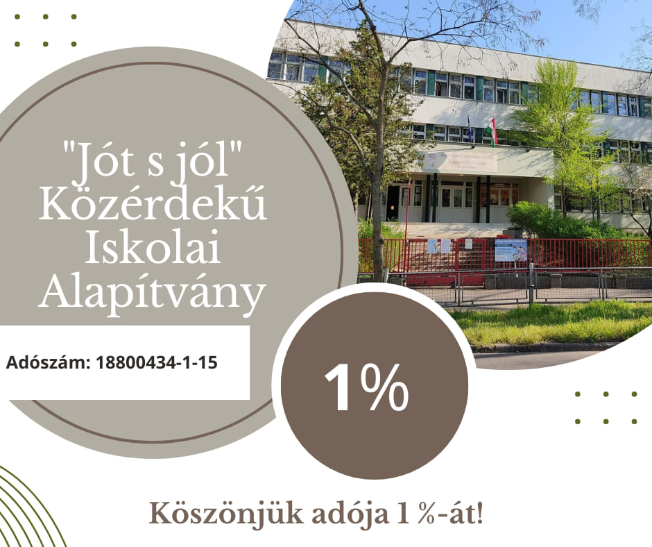 Adód 1%-ával te is hozzájárulhatsz ahhoz, hogy gyermekeink a legjobb környezetben tanulhassanak! Adószámunk: 18800434-1-15