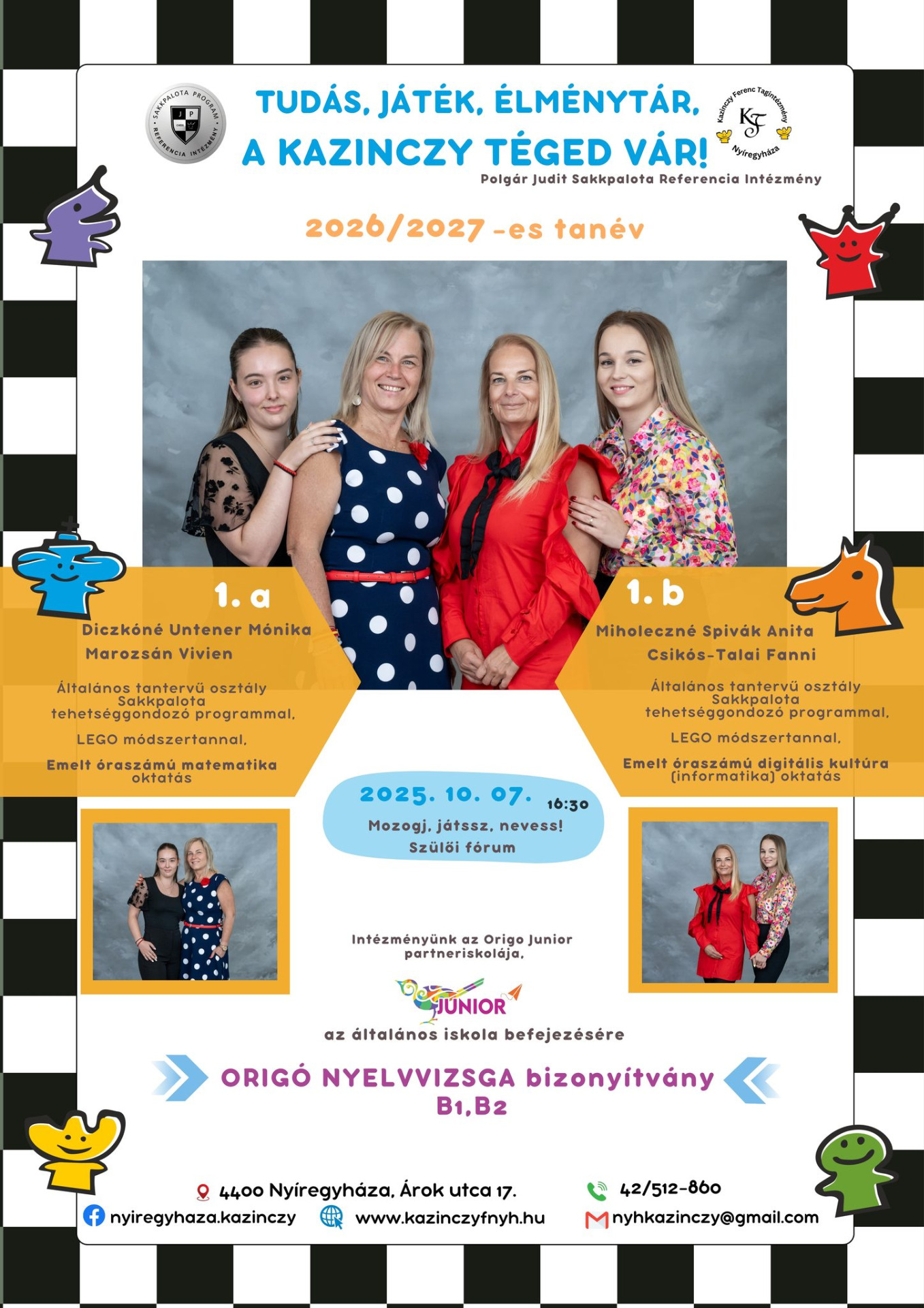 Segítünk a döntésben!Szeretettel hívjuk Önöket és nagycsoportos gyermeküket iskolába csalogató foglalkozásainkra a Kazinczy Ferenc Tagintézménybe, ahol: betekintést nyerhetnek iskolánk mindennapjaiba, megismerkedhetnek a leendő elsős tanító nénikkel,gyermekeik játékos foglalkozásokon keresztül tapasztalhatják meg, milyen is lehet "iskolásnak" lenni. Célunk, hogy a gyerekek ne csak halljanak az iskoláról, hanem biztonságos, örömteli élményeken keresztül kapcsolódjanak hozzá – már az első pillanattól kezdve.Az első foglalkozás időpontja: 2025. október 7. (kedd) 16:30Helyszín: Kazinczy Ferenc Tagintézmény, Nyíregyháza, Árok utca 17.A délután során egy szülői fórum keretében válaszolunk minden kérdésükre, miközben a gyerekek vidám foglalkozásokon vehetnek részt.Szeretettel várják Önöket a leendő elsős tanító nénik:Mónika néni, Vivien néni, Anita néni és Fanni néni.